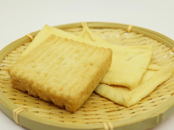 木綿豆腐(地域によっては絹も)を水切りして、表面を高温で揚げる食品。内部は豆腐のままなので、ふくよかな大豆の風味と食べ応えが残ります。別名「生揚げ」。
