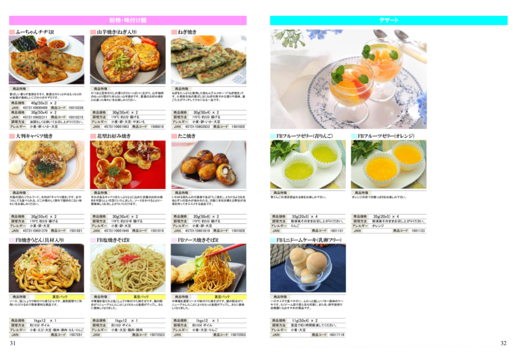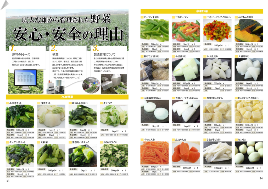 まずはこちら、冷凍野菜のとあるページです。様々な用途に合わせたサイズ、カットのものをご用意しております。色とりどりの野菜でお弁当をパッと華やかにします。すでにカットされているものは家庭で使用するときもとっても便利ですよね。私もこの会社に入ってから冷凍野菜を使うようになりましたがその便利さに驚きました。少量多品種の野菜がカット、下処理されていてお鍋に入れるだけ、こんなにありがたいことはありません。